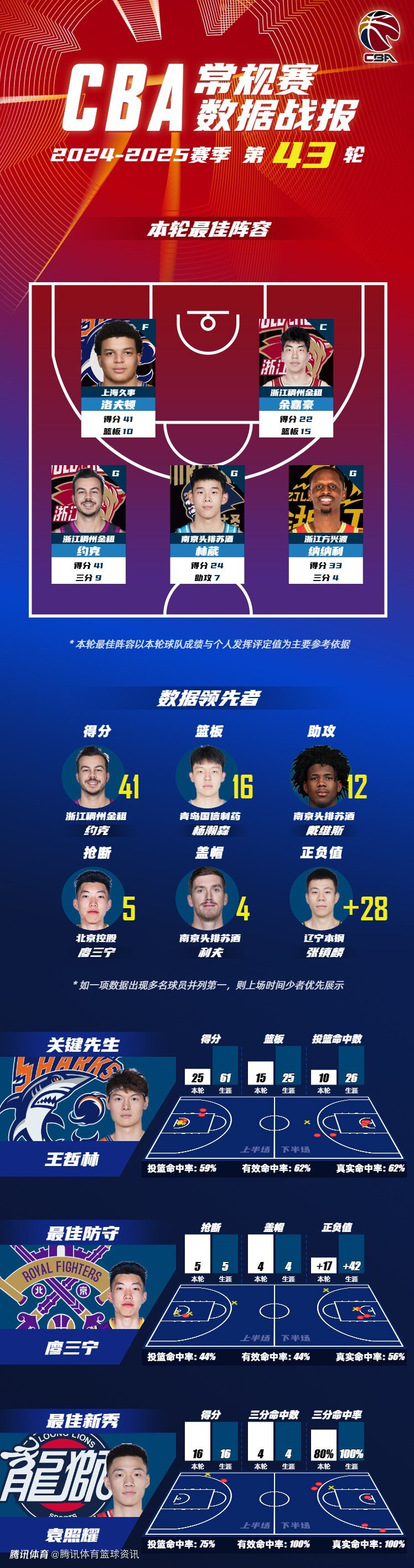 第43轮最佳阵容为:上海男篮的洛夫顿(41分10篮板)、浙江男篮的余嘉豪(22分15篮板)、浙江男篮的约克(41分,命中9个三分球)、南京同曦男篮的林葳(24分7助攻)、浙江广厦的纳纳利(33分,命中4个三分球)。