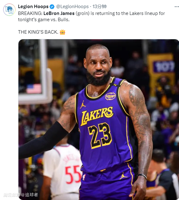 2025-03-23 11:00北京时间3月23日,NBA常规赛湖人对阵公牛,湖人队多名球员同时迎来复出,詹姆斯、东契奇、八村垒、里夫斯、芬尼-史密斯和范德比尔特全都可以出战,其中詹姆斯伤停7场后重返赛场引热议,美媒纷纷晒海报欢迎詹姆斯回归。