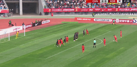 第77分钟,中国队的人墙,将韩国队主罚的任意球挡出。