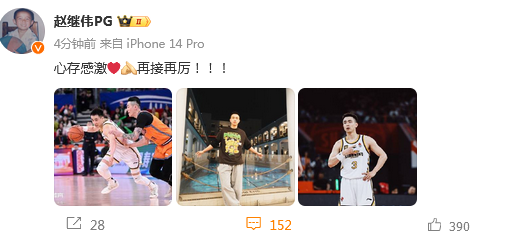 不久前,赵继伟更新社交媒体发文说道:心存感激,再接再厉。