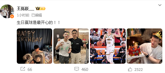 王岚嵚也更新社交媒体发文说道:“生日赢球是最开心的”。