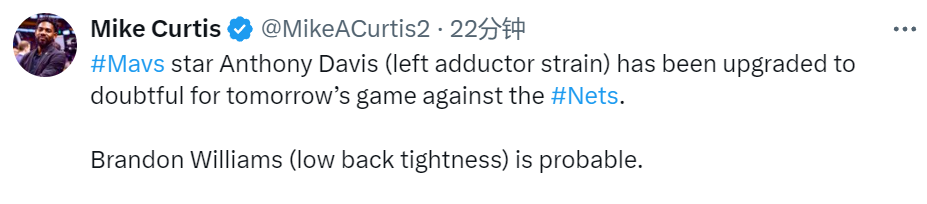 2025-03-24 06:10北京时间3月24日,独行侠官方更新明日对阵篮网的伤情,浓眉内收肌拉伤后首次状态升级,目前他的状态是小概率出战(上场可能25%)。未来24小时,浓眉的状态有可能继续升级,这意味着他最快明日能够复出。