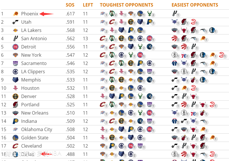 对于独行侠来说,他们和太阳竞争附加赛席位的优势除了浓眉的即将复出,还包括赛程上的优势。太阳余下11场比赛的难度排名联盟第一,是最难的,而独行侠余下11场比赛的难度排名联盟第18位。大家认为浓眉复出后能帮助独行侠挤掉太阳吗?欢迎留言发表看法。