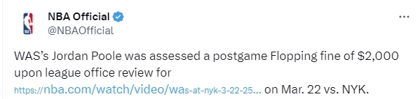 2025-03-24 07:20北京时间3月24日,NBA官方宣布,奇才队球员乔丹-普尔因为假摔,被联盟罚款2000美元。