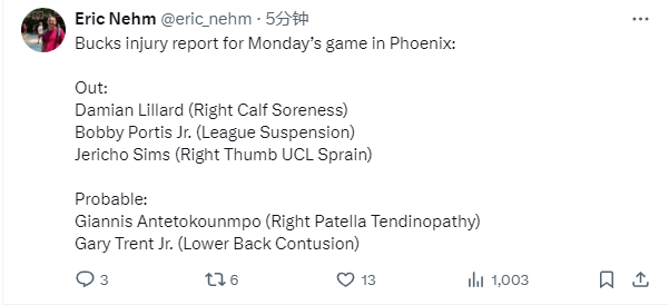 达米安-利拉德(右小腿酸痛)、小鲍比-波蒂斯(联赛禁赛)、杰里科-西姆斯(右拇指扭伤)缺席比赛。字母哥(右髌骨肌腱病)、小加里-特伦特(下背部挫伤)大概率出战。