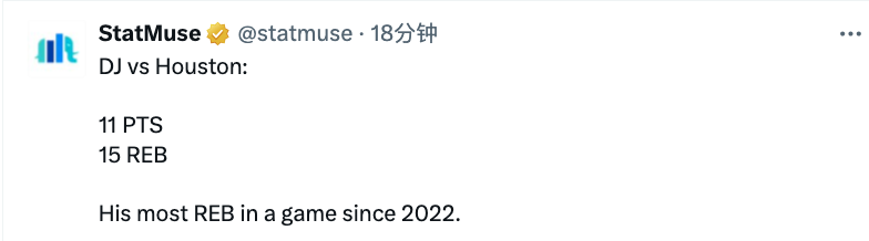 本场比赛约基奇继续缺席,小乔丹代替他首发表现出色,在首发38分钟的上场时间里,7投5中拿到11分15篮板4助攻1抢断,正负值来到+5,其中篮板和助攻均创下个人赛季新高,另外这15个篮板球,也是自2022年以来,他在单场比赛中抢到的最多篮板数。