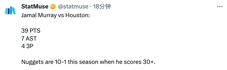 另外穆雷本场比赛发挥同样惊艳,在首发37分钟的上场时间里,28中15,三分球6中4拿到39分4篮板7助攻,据统计本赛季当他得分来到30+,掘金的战绩来到了10胜1负。
