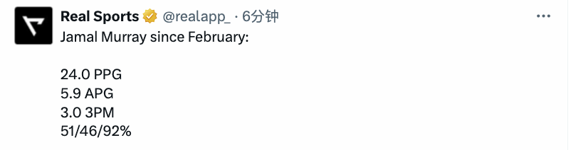 从2月份至今,穆雷场均可以拿到24分5.9助攻,场均命中3个三分球,三项命中率分别来到51%、46%和92%。