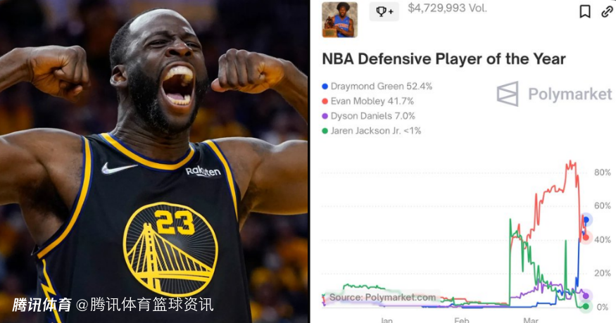 2025-03-24 10:50北京时间3月24日,数据媒体PolyMarketSport更新预测,追梦已经超越莫布利,成为年度最佳防守球员(DPOY)的头号热门人选。