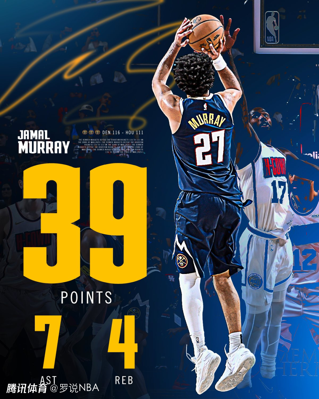 在一场西部关键的排位战上,缺少约基奇的掘金击败火箭,缩小了两队之间的差距。穆雷轰下39分7助攻,为掘金立下头功。申京17分14篮板10助攻,格林30分5助攻,但两人都在关键时刻罚球不中,9连胜就此被终结。火箭依然排在西部第二,但领先掘金的优势只剩下1个胜场。