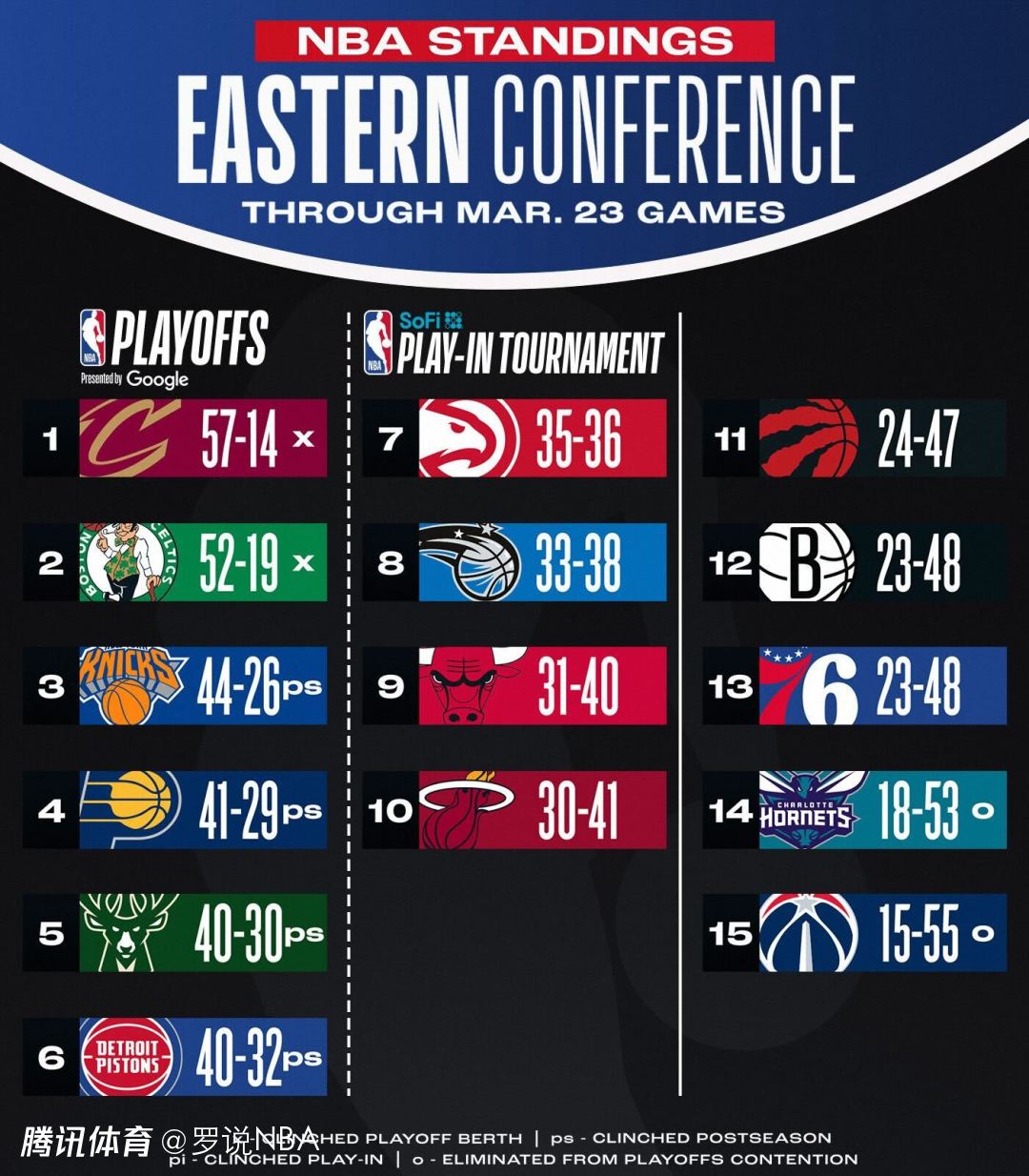 排在东部第11的猛龙也遭遇4连败,这也让东部附加赛区的悬念几乎消失。排名东部第10的热火,击败黄蜂终结10连败后,他们已经领先猛龙6个胜场,维金斯本场轰下42分。东部第7的老鹰,落后东部第6的活塞4.5个胜场。大概率参加东部附加赛的球队就是老鹰、魔术、公牛和热火,但附加赛区内的具体排名或许会有变化。