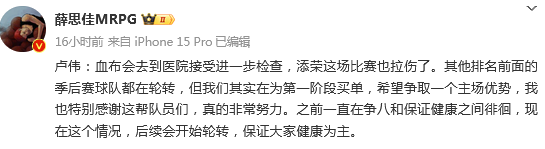 卢伟说道:每一支球队都在为季后赛做准备,但到底是要健康,还是要前八是一个矛盾的问题,我们这几场打得比较挣扎,非常感谢李弘权几个主力球员拼到最后非常不容易。我们现在遇到了2个问题,到底是要全员健康,还是要拼前八呢。