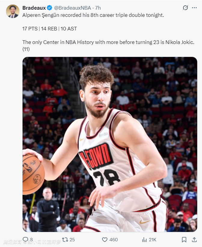 申京全场比赛15中6拿到17分14篮板10助攻2抢断1盖帽0失误,他是这场比赛发挥最出色的那个,他拿到生涯第八次三双,NBA23岁以下的中锋球员里只有约基奇比他多,休媒盛赞了申老师的表现。