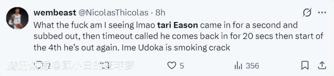 “这XX怎回事,笑死了我,伊森刚刚打了一会儿就被换下了,乌度卡暂停让他上了20秒就让他下场,这一待就直接到了第四节,乌度卡是在嗑Y吗?”