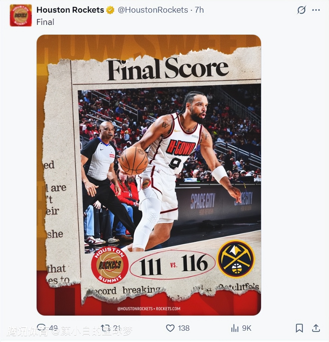 2025-03-24 20:40火箭主场111-116惜败掘金结束9连胜。这场比赛火箭输得离奇,赛前ESPN给出火箭赢球概率超过87.5%,因为这支掘金没有约基奇还正值2连败士气低落,没想到火箭上半场篮板球与反击得分都完败残阵掘金,第三节更是被穆雷一人摧毁,末节最关键的时刻也未能把握住机会。