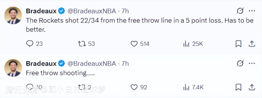 随后休媒开始讨论火箭的败因,Bradeaux写道:这场比赛火箭队罚球34中22是一个关键点,丢了12罚最后只输5分。