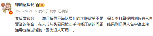 山西主帅潘江出席新闻发布会批评了球队的求胜欲望不足,刘传兴+迪亚洛的组合,在末节从头到尾被对手内线压制的问题,潘江给出的回复是“因为没人可用”。