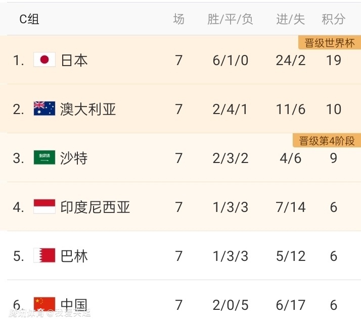 目前7轮战罢,日本积19分提前出线。澳大利亚和沙特分别积10分和9分,在争夺本组另外一个直通名额的竞争中占据先机。印尼、巴林和中国男足都积6分,但国足净胜球最少为-11。