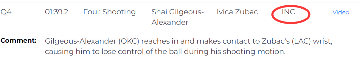 裁判报告指出,这是一次漏判,亚历山大伸手触碰了祖巴茨的手腕,致使祖巴茨在投篮动作中失去对球的控制。慢镜头显示,亚历山大还有拉拽球衣的动作。这次漏判,快船吃亏,雷霆获利。祖巴茨本该获得两次罚球机会,而快船最终正好输掉两分。