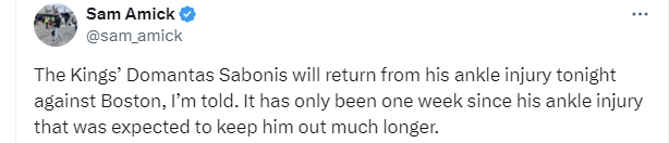 该记者写道:“我被告知,国王队的小萨博尼斯将在今晚对阵波士顿的比赛中复出。距离他的脚踝受伤才过去一周的时间,原本预计他会缺阵更长的时间。”