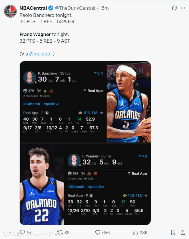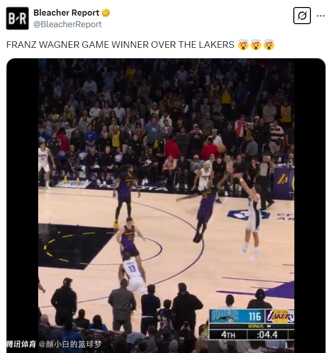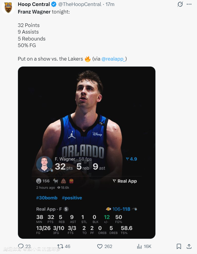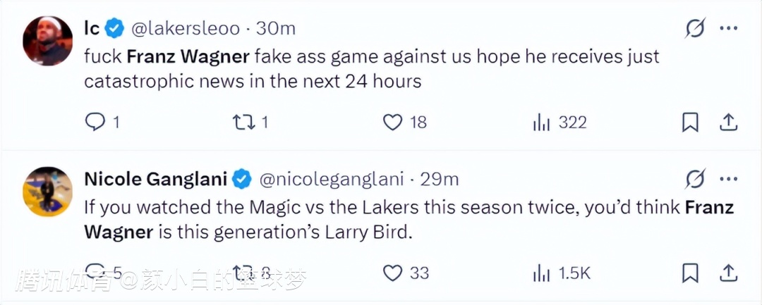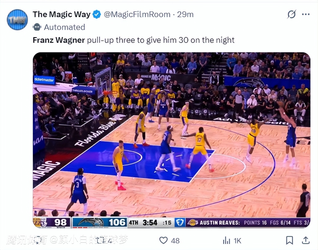 魔术记者:如果你看过本赛季魔术队对阵湖人队的比赛两回,你就会觉得弗朗茨-瓦格纳是这一代人中的拉里-伯德。