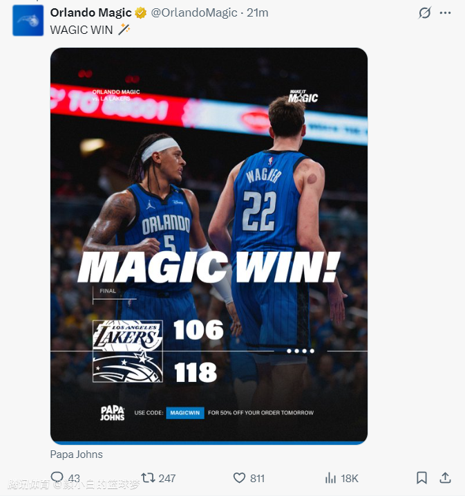 不过此役小瓦格纳才是击败湖人的关键,他末节11中5+三分3中1拿到11分4助攻1篮板1抢断,包括那个决胜一击的三分球,他再一次用三分让湖人全队失去气势。