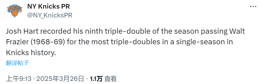 2025-03-26 09:40北京时间3月26日,NBA常规赛继续进行,尼克斯队对阵独行侠队。本场比赛进行到第四节,尼克斯球员哈特已经有16分12篮板11助攻入账,这是他本赛季个人砍下的第9个三双,也打破了尼克斯队史纪录。