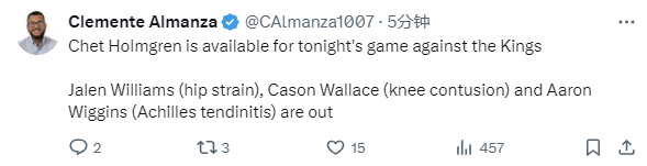 杰伦-威廉姆斯遭遇臀部拉伤、卡森-华莱士遭遇膝盖挫伤,维金斯遭遇跟腱炎。雷霆队方面也排出了亚历山大、多尔特、肯里奇-威廉姆斯、切特-霍姆格伦和哈尔滕施泰因的首发阵容。