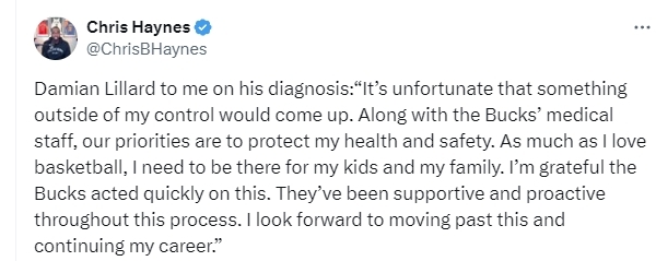 利拉德对名记Hayes谈及自己的诊断结果:“很不幸,出现了这种我无法控制的状况。和雄鹿队的医疗团队一样,我们的首要任务是保障我的健康与安全。尽管我无比热爱篮球,但我也得为孩子们和家人着想。我很感激雄鹿队迅速采取行动,在整个过程中,他们始终给予支持,积极应对。我期待顺利渡过这一难关,继续我的职业生涯。”医生Evan Jeffries在个人推特上表示,利拉德正在服用血液稀释剂,通常至少要服用3个月,他很可能会像文班亚马一样缺席本赛季剩余比赛。