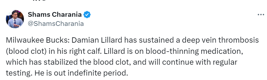 雄鹿遭重创!利拉德右小腿出现深静脉血栓 目前是无限期缺阵状态