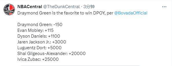 最新的DPOY赔率——1、追梦格林-150;2、埃文-莫布利+115;3、戴森-丹尼尔斯+1100;4、小贾伦-杰克逊+3000;5、多尔特+5000;6、亚历山大+20000;7、祖巴茨+25000
