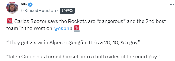 布泽尔说道:“西部有很多强队,包括掘金、湖人、快船、勇士等等,但火箭队是第二好的球队,他们是一支很危险的球队,他们拥有一位明星球员申京,他是一名能场均砍下20分10篮板5助攻的选手,杰伦-格林也能在场上攻防两端发力,他能防守,也能场均砍下20+。”