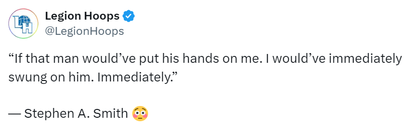 A-史密斯表示:“如果詹姆斯敢碰我,我会毫不犹豫地反击,立刻就动手!”