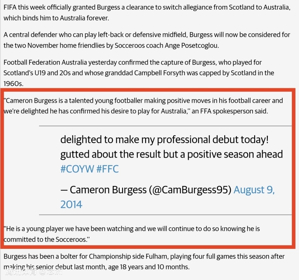 按照该博主的说法,伯吉斯在2013年10月10日首次代表苏格兰出战官方赛事,他的会籍已经与苏格兰足总绑定,想要代表澳大利亚,需要申请转换协会。
