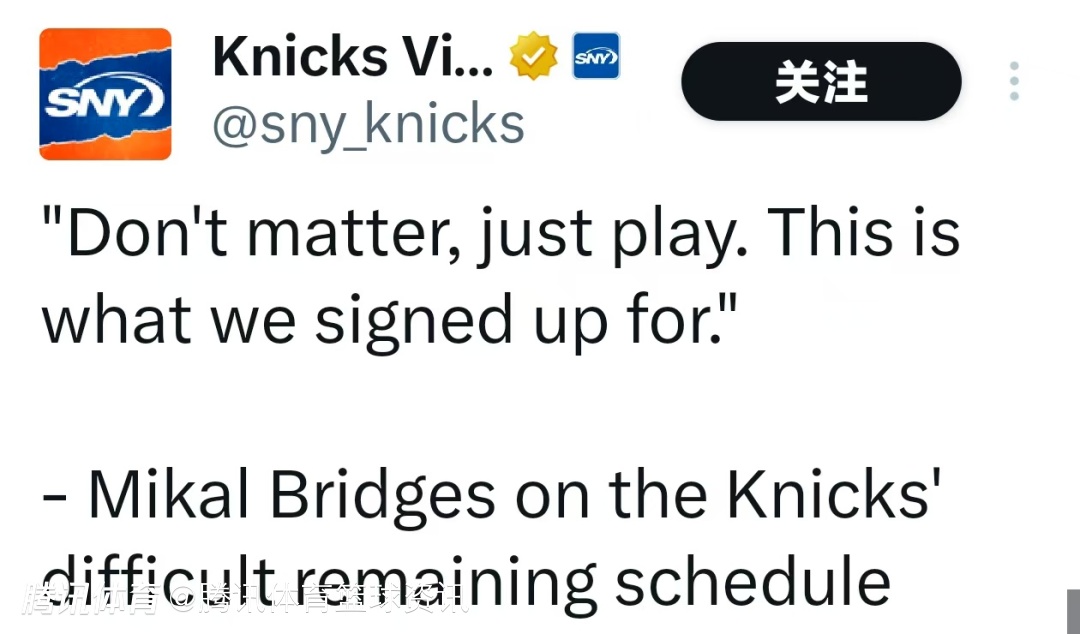 谈及尼克斯队接下来艰难的赛程,布里奇斯表示:“这都无关紧要,全力去打就行。这本来就是我们选择要面对的。”