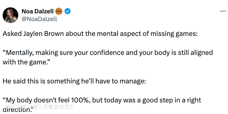 布朗透露自己目前正受上场时间限制,他表示正在学习如何应对这一状况:“这对我来说是个新课题。职业生涯中我的膝盖从未出现过问题,所以现在正在努力建立一套科学的准备流程,确保每晚都能以最佳状态出战,但不得不说,这在心理层面确实给我带来了挑战。我的身体状态感觉还没恢复到100%,但今天是朝着正确方向迈出的良好一步。”