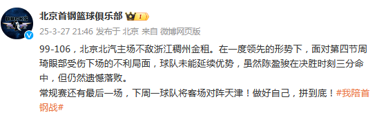 赛后,北京男篮官方社交媒体发文说道:99-106,北京北汽主场不敌浙江稠州金租。在一度领先的形势下,面对第四节周琦眼部受伤下场的不利局面,球队未能延续优势,虽然陈盈骏在决胜时刻三分命中,但仍然遗憾落败。