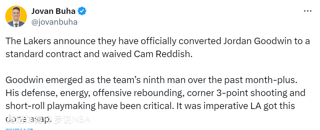 湖人队记Buha表示,在过去一个多月的时间里,古德温成为了湖人队的重要轮换球员,担当起球队第九人的角色。他在防守端的积极表现、旺盛的场上活力、出色的进攻篮板能力、精准的底角三分投射,以及在挡拆顺下时的组织能力,都对球队至关重要。对于湖人队而言,完成这一操作势在必行。
