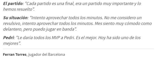 费兰-托雷斯:“我努力珍惜每一分钟。我不认为自己是一个奇兵,我只是努力利用好每一分钟。我作为前锋感觉很舒服,但我也能打边路。”