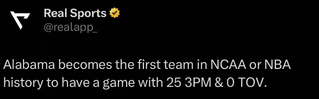 2025-03-28 10:10北京时间3月28日,NCAA疯三16强赛,阿拉巴马大学以113-88大胜杨百翰大学,全场战罢,阿拉巴马大学在三分线外51中25,命中率高达49%,且全场没有一次失误,这样一来,他们也成为了第一支NCAA或NBA历史上命中25+三分球且0失误的球队。