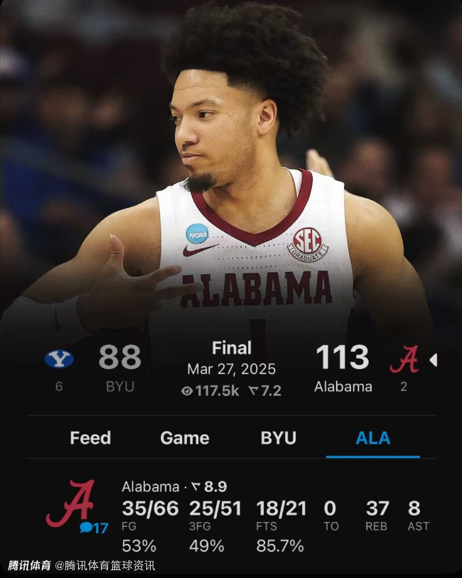NCAA+NBA史上首现!阿拉巴马轰25记三分0失误:大胜杨百翰晋级