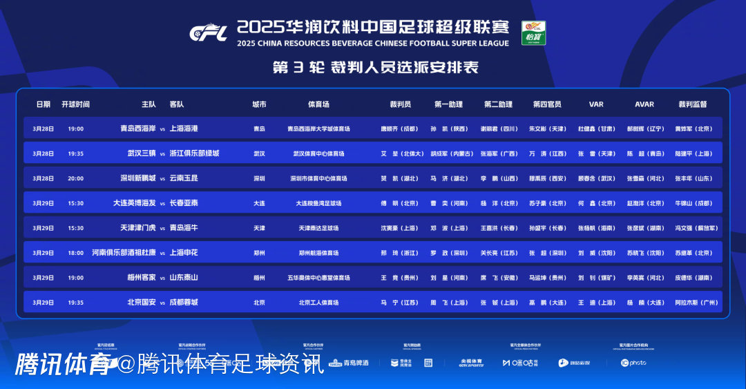2025-03-28 10:40北京时间3月28日,中超联赛官方公布第3轮裁判人员选派安排表,本轮重头戏北京国安对阵成都蓉城的比赛将由国际级裁判马宁担任主哨。