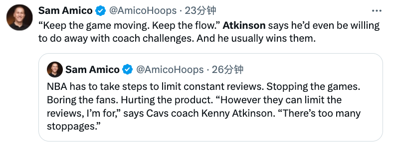 阿特金森:联盟必须采取措施限制频繁录像回看 这会消磨球迷热情且损害比赛观赏性