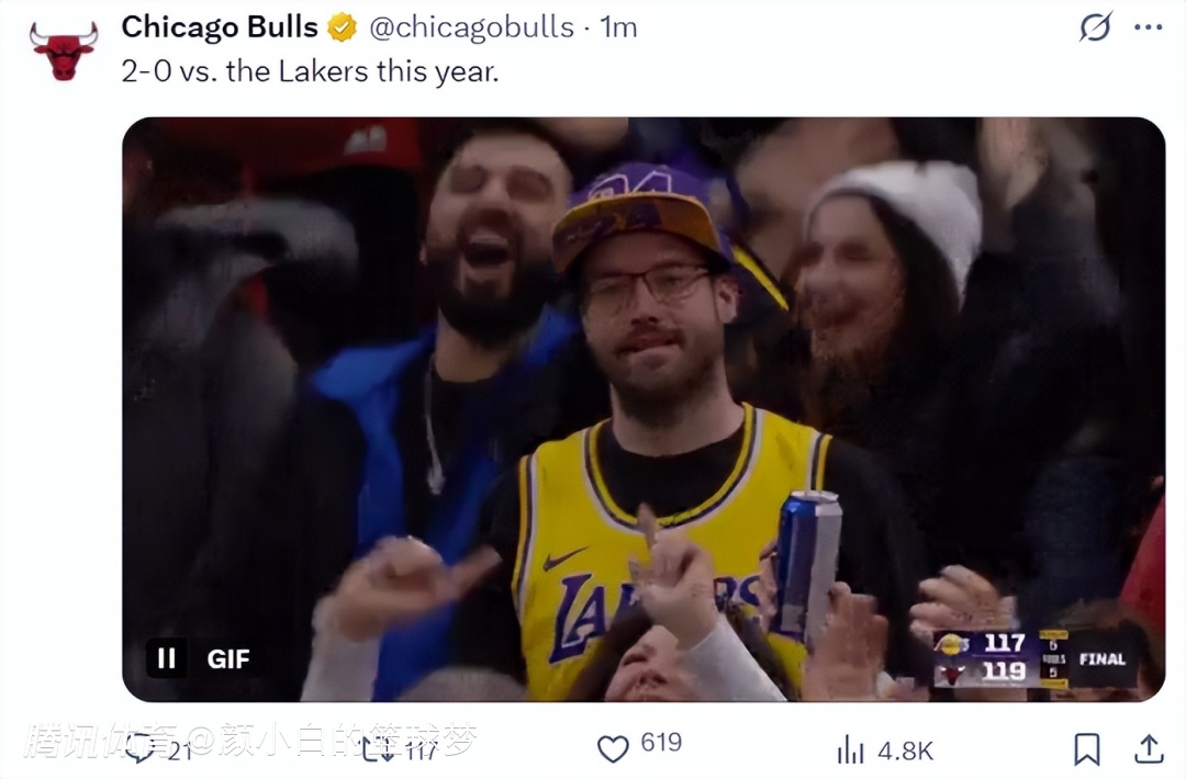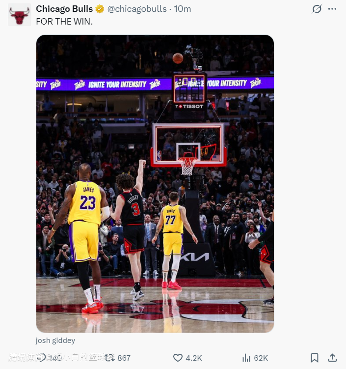 公牛官方晒吉迪绝杀一幕:湖人球迷面如死灰 全场疯狂庆祝横扫豪门