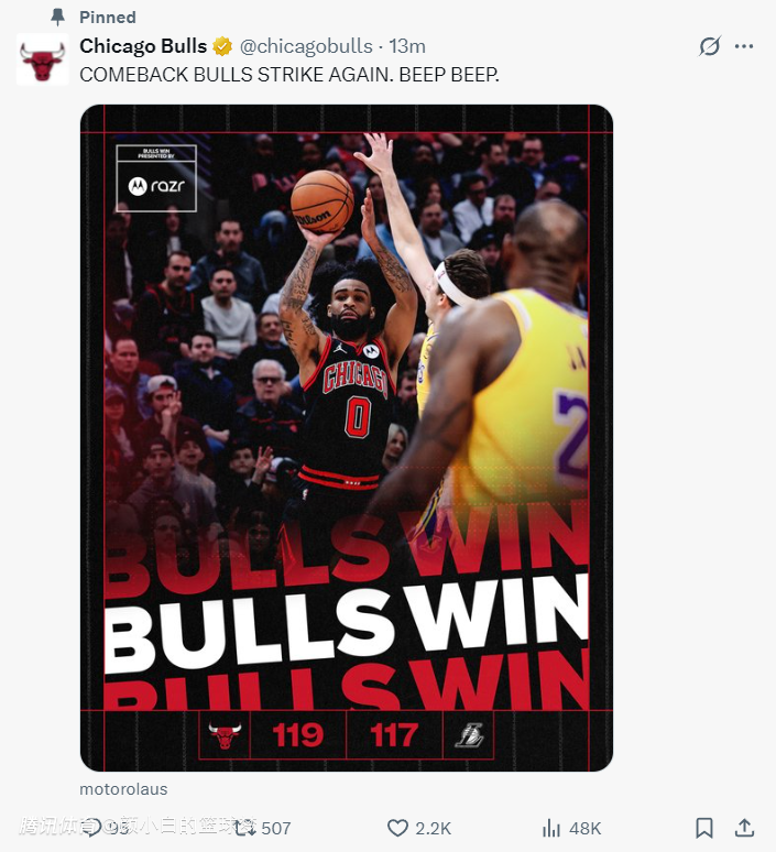 2025-03-28 11:10北京时间3月28日,芝加哥公牛主场119-117险胜洛杉矶湖人队,这场比赛公牛一度领先13分但在第三节被反超,末节湖人牢牢掌控局势,最终12秒公牛都还落后5分,没想到戏剧性的剧情上演了,这说明NBA的确是发生奇迹的地方,本赛季公牛横扫湖人。