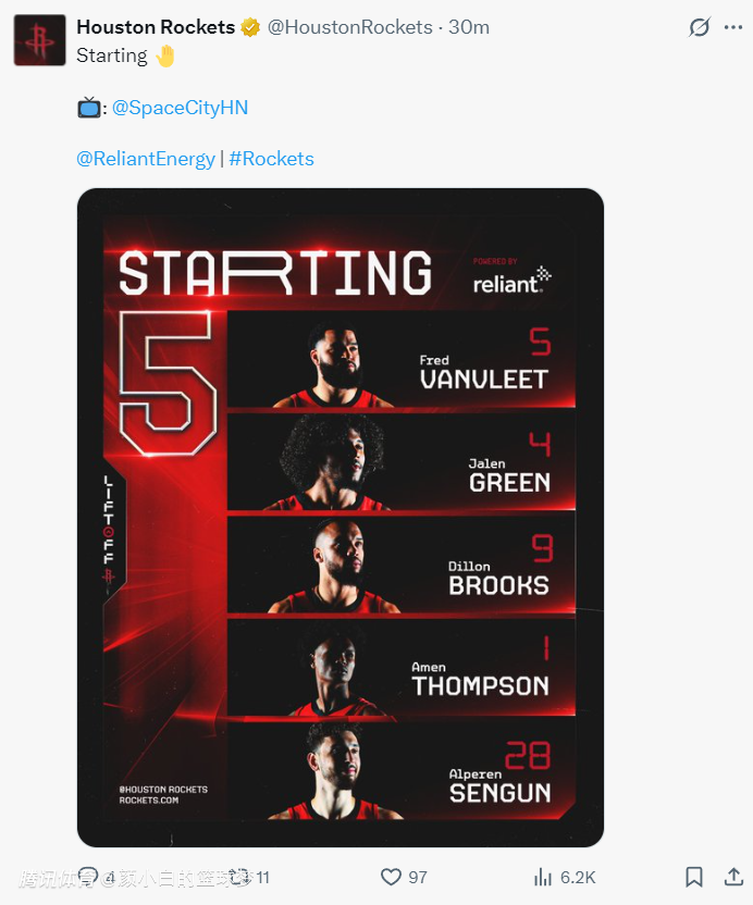 火箭:范弗利特、格林、狄龙、阿门、申京;