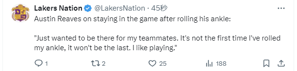 在谈到自己脚踝扭伤后为何能继续坚持比赛时,里夫斯说道:“我只是想要为了我的队友们而战。这不是我第一次在比赛中扭伤脚踝,也不会是最后一次。我喜欢打球。”