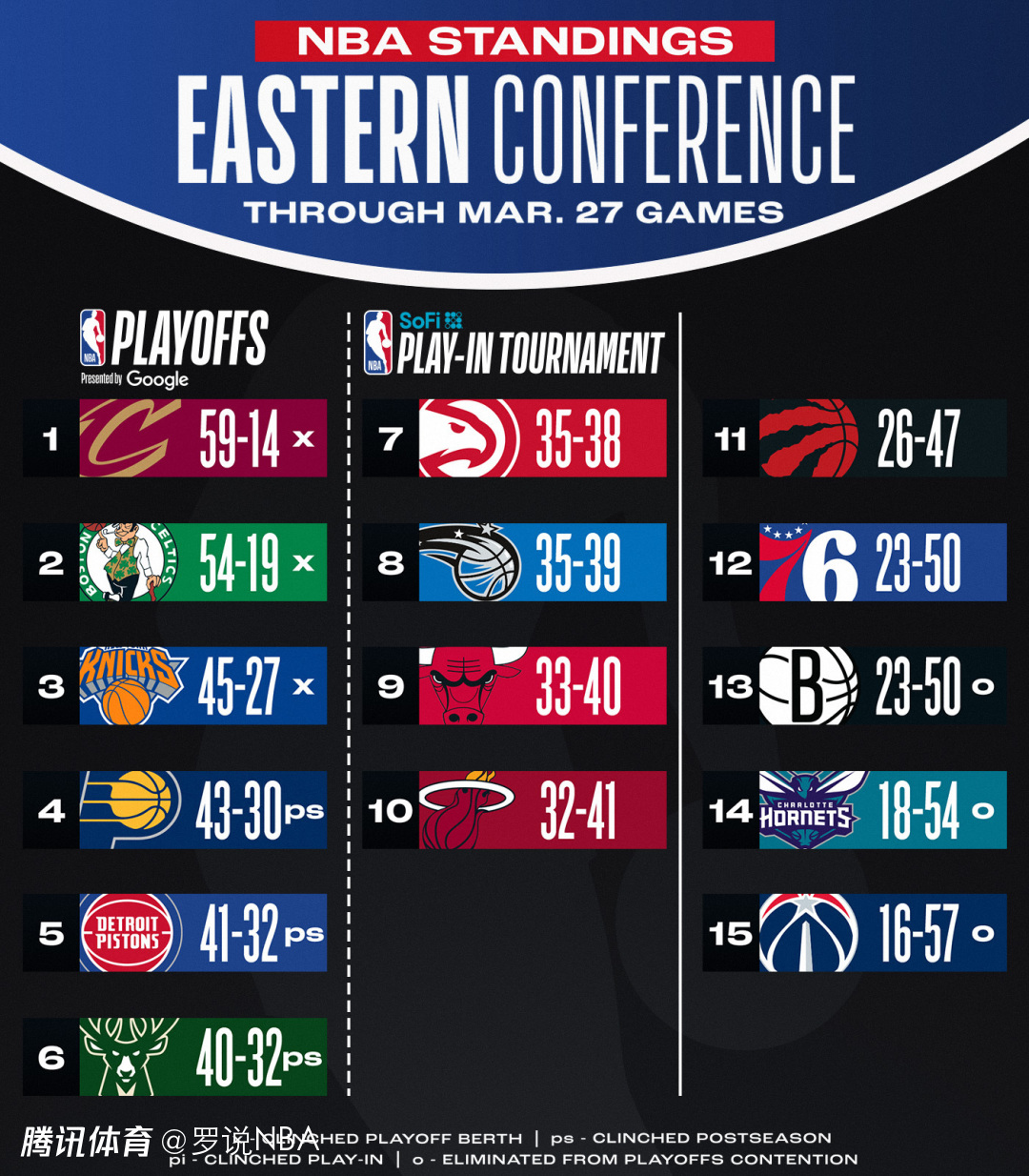 老鹰输掉比赛后,和身后的魔术之间只差0.5个胜场,东部附加赛区的四支球队应该已经确定,但具体排名还是悬念重重。