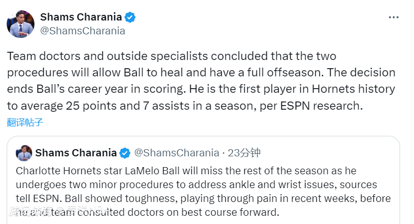 2025-03-29 05:50北京时间3月29日,据名记Shams报道 ,黄蜂队的球星拉梅洛-鲍尔将缺席本赛季剩余的比赛,因为他需要接受两项小手术来治疗右脚踝和手腕的伤病问题。
