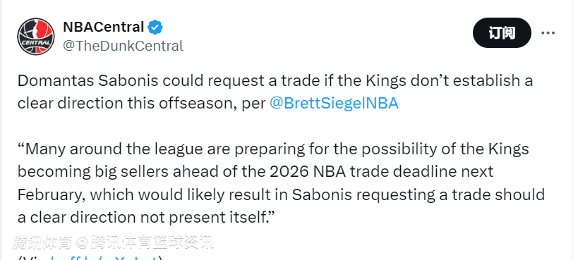 该记者写道:“联盟中的许多人都在为国王队在明年2月NBA交易截止日前成为大卖家的可能性做准备,如果没有明确的发展方向,小萨博尼斯很可能会要求交易。”
